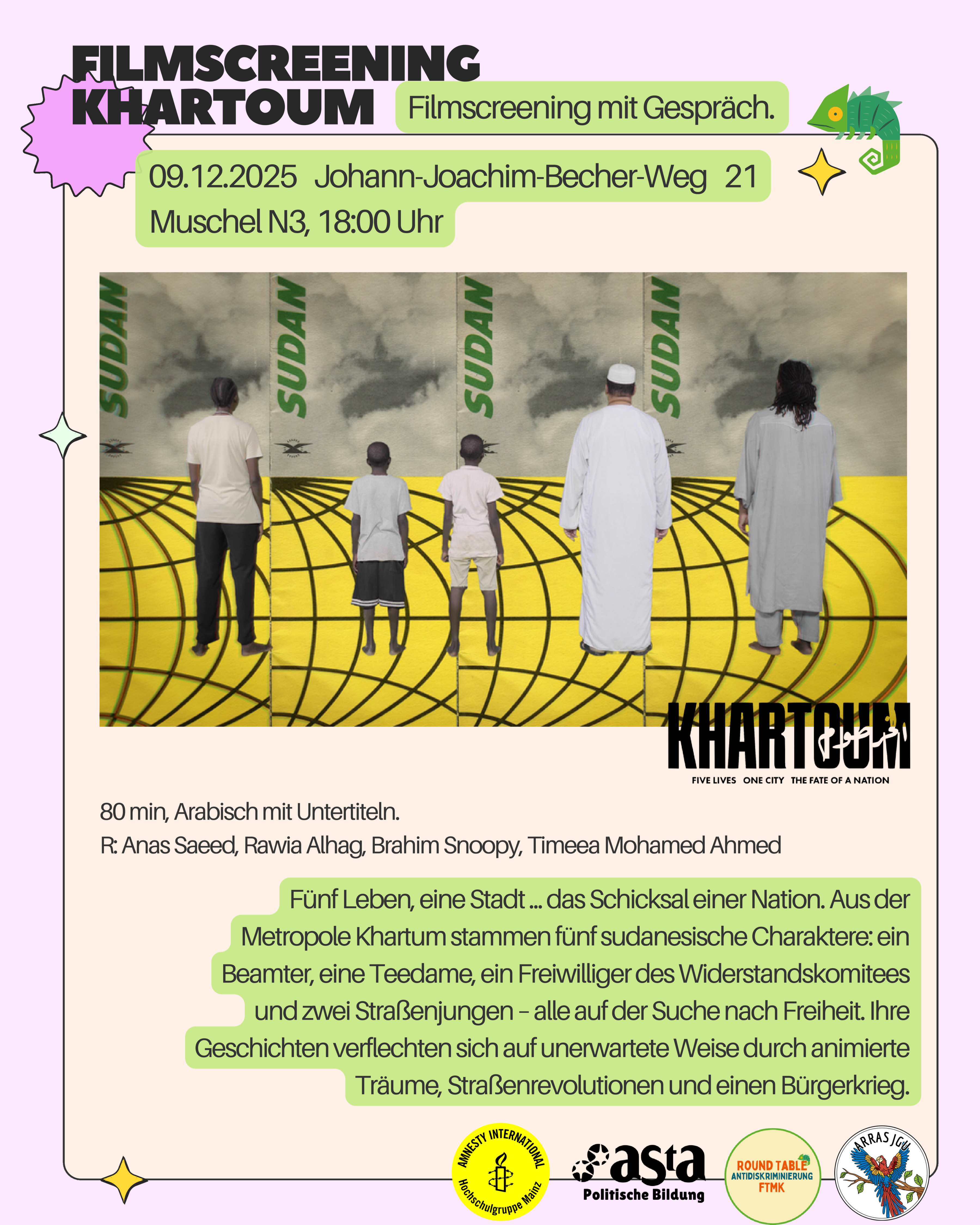 Fünf Leben, eine Stadt, ein geteiltes Schicksal: Khartoum erzählt von fünf Menschen aus der sudanesischen Hauptstadt — einem Beamten, einer Teedame, einem Freiwilligen des Widerstandskomitees und zwei Straßenjungen. Ihre Wege verflechten sich zwischen animierten Träumen, Straßenrevolutionen und den Folgen eines Bürgerkriegs. Nach dem Film laden wir zu einem Gespräch ein.